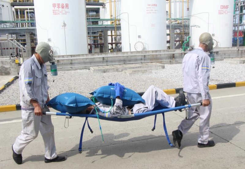 模拟罐区甲苯(V02111)罐底阀前端法兰接口甲苯泄漏,现场可燃气体检测仪和中央控制室报警,人员在查看过程中,中毒倒在罐区现场,且下风向甲苯污染严重,立即启动现场应急处置方案,抢救中毒人员,被污染区人员紧急撤离,并对泄漏点进行紧固堵漏,但仍大量泄露,判断为法兰垫片损坏,无法堵漏。