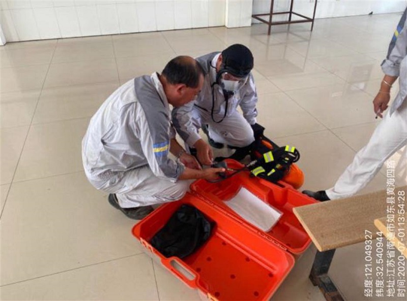 3.演练前在公司食堂对参演人员按应急救援组织机构安排座位,进行流程讲解与交流讨论,对参演人员讲解自给式呼吸器、全封闭防化服等防护器材的使用方法,做到能够熟练使用。